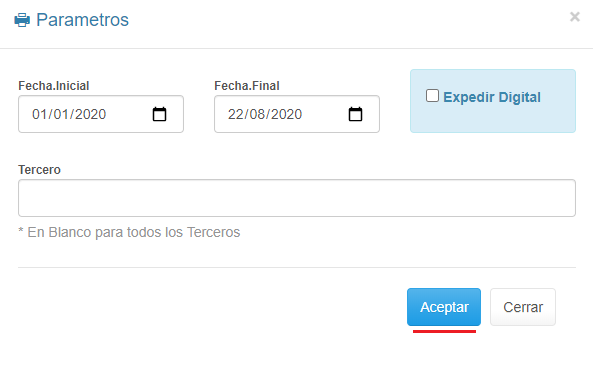 4. Diligencia el formulario, digitando el rango de fechas requerido e ingresa el Tercero, para finalizar haz clic en el botón Aceptar.