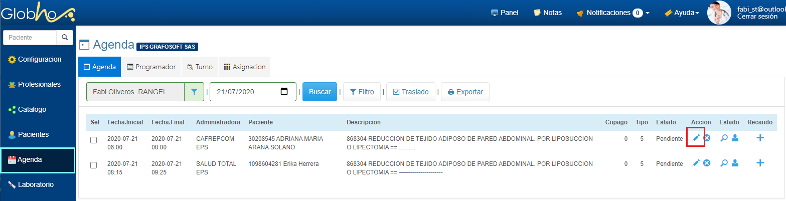 1. Ingresa a menú Agenda y haz clic en el botón en forma de Lápiz respectivo a la cita del Procedimiento.