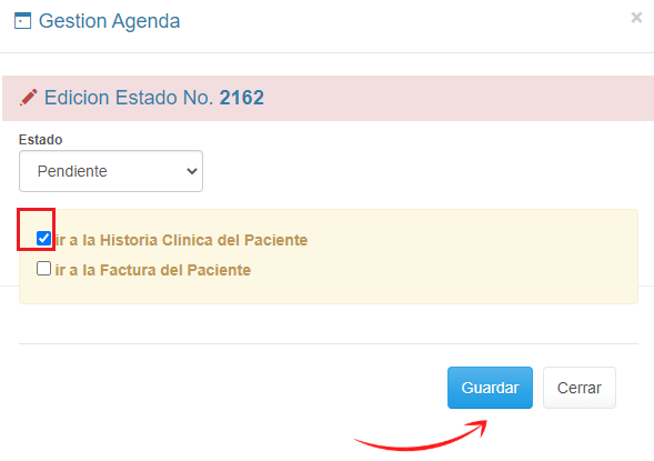 2. Selecciona en el Estado la opción Asistió, haz clic en la casilla de verificación Ir a Historio Clínica del paciente y haz clic en el botón Guardar.