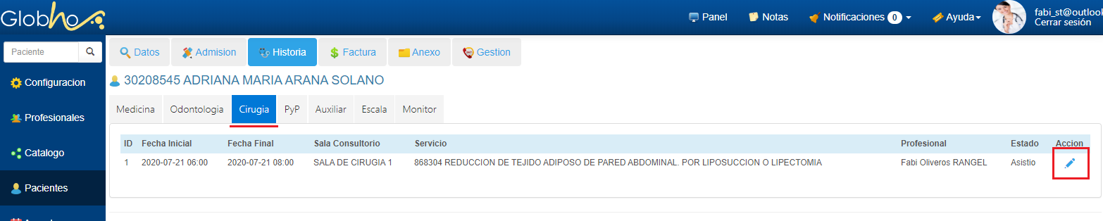 3. En el módulo Historia, haz clic en la opción Cirugía. 4. Para ingresar a la Sala de Cirugía, haz clic en el botón en forma de Lápiz al final del Servicio Agendado.