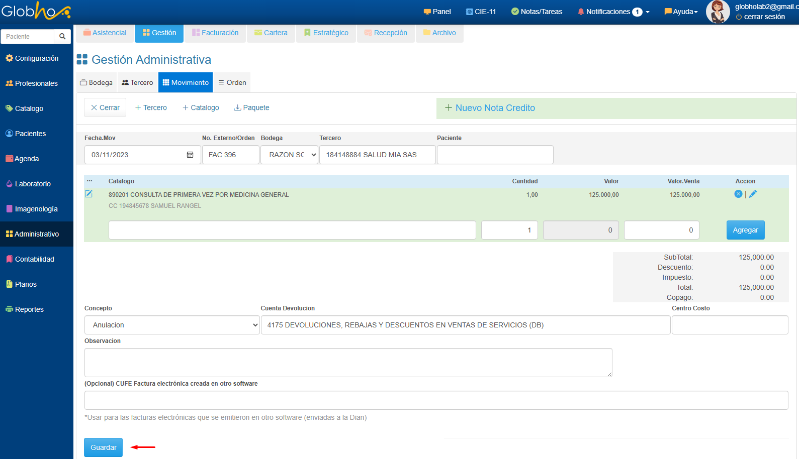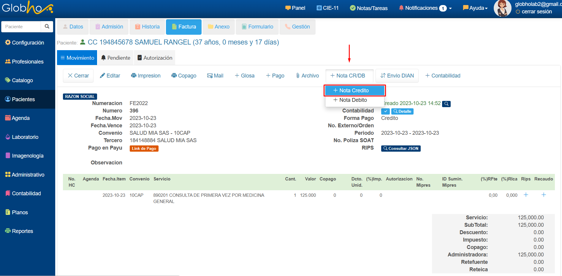 1. En el Detalle de la Factura previa haz clic en el botón + Nota CR/DB y selecciona la opción + Nota Crédito.