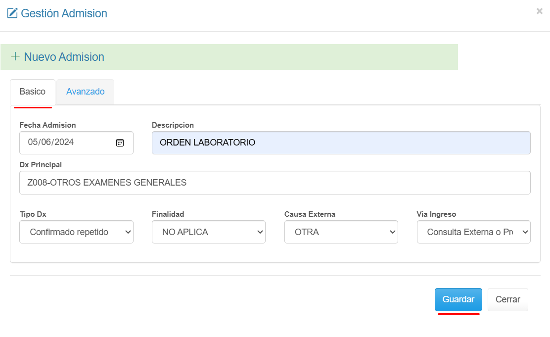1. Selecciona el Paciente al que le vas a realizar el registro. Ver aquí 2. Selecciona la pestaña Admisión para ingresar la Orden Externa del Paciente.