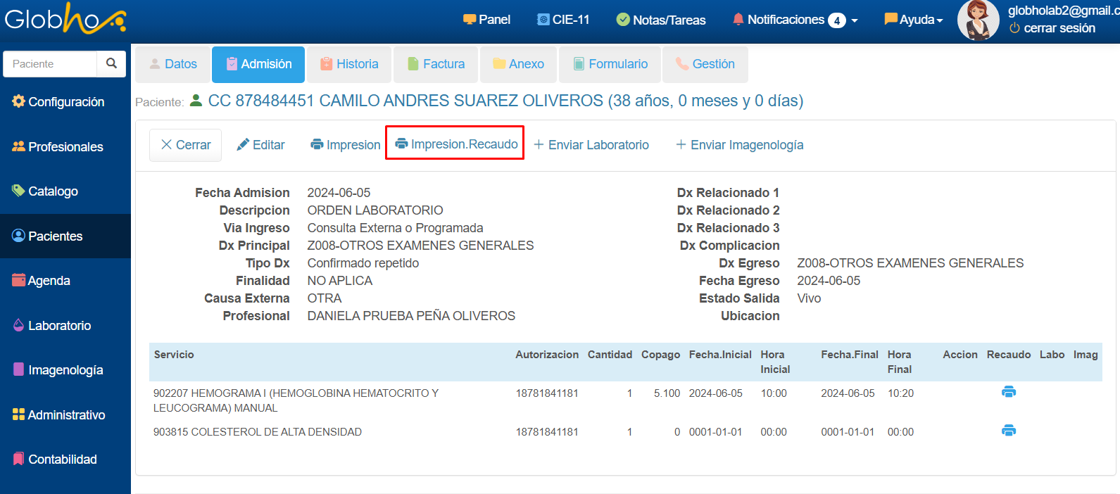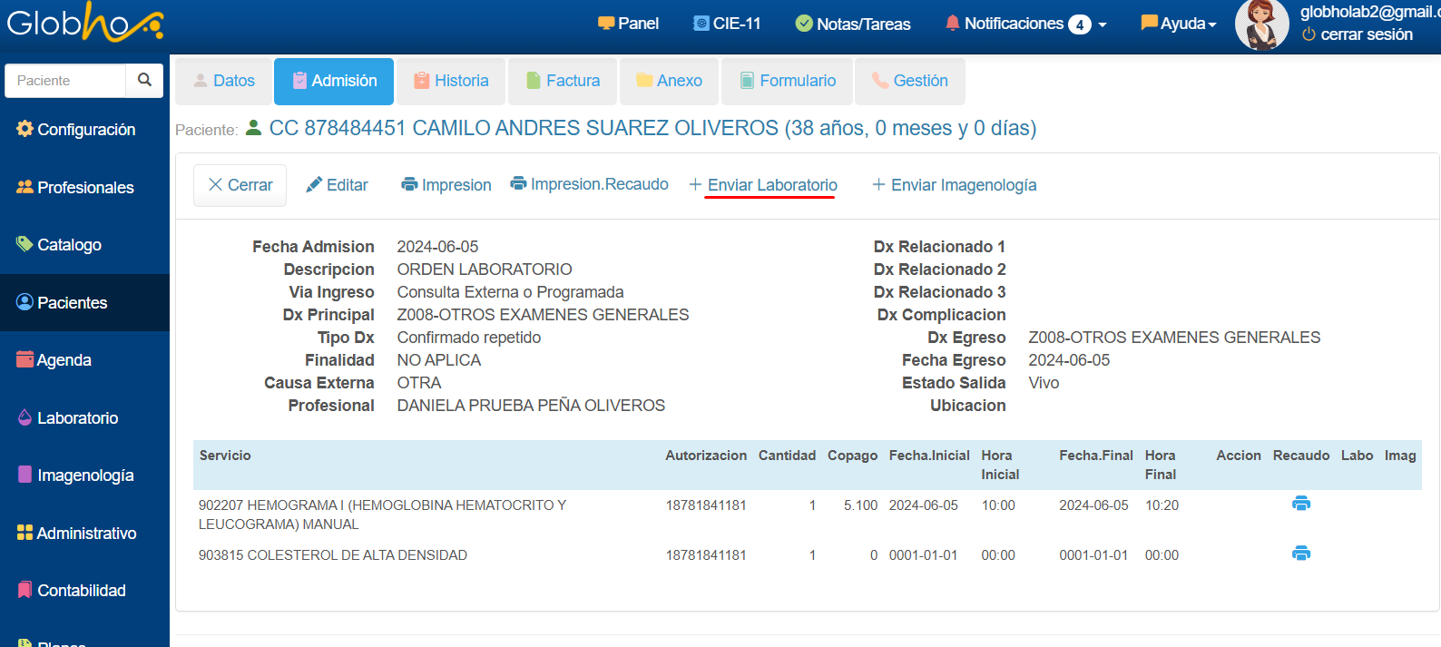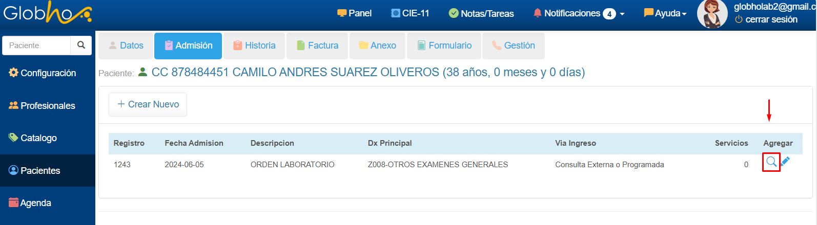 4. Haz clic en la Lupa para ingresar a gestionar toma, resultado y/o envío del laboratorio.