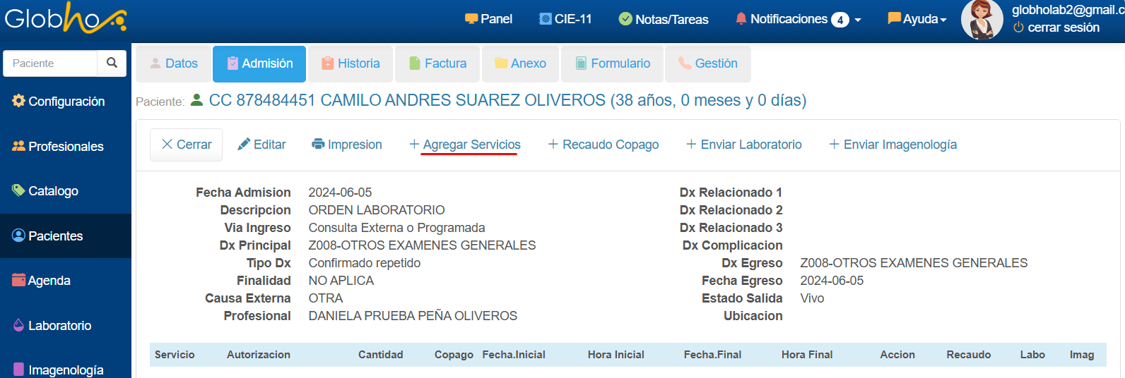 6. Haz clic en + Agregar Servicios, para agregar los Laboratorios Ordenados.