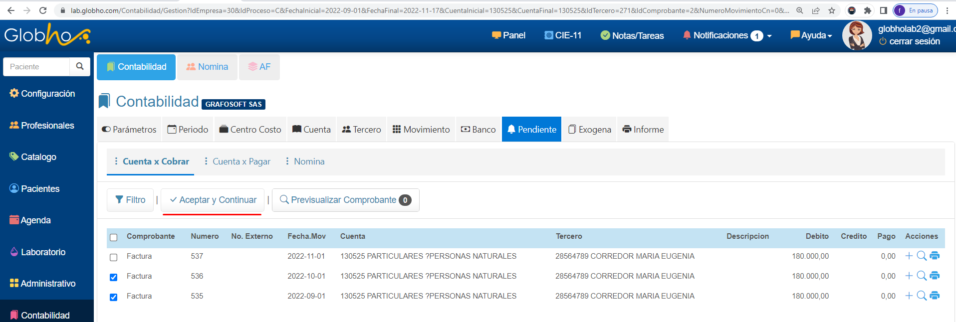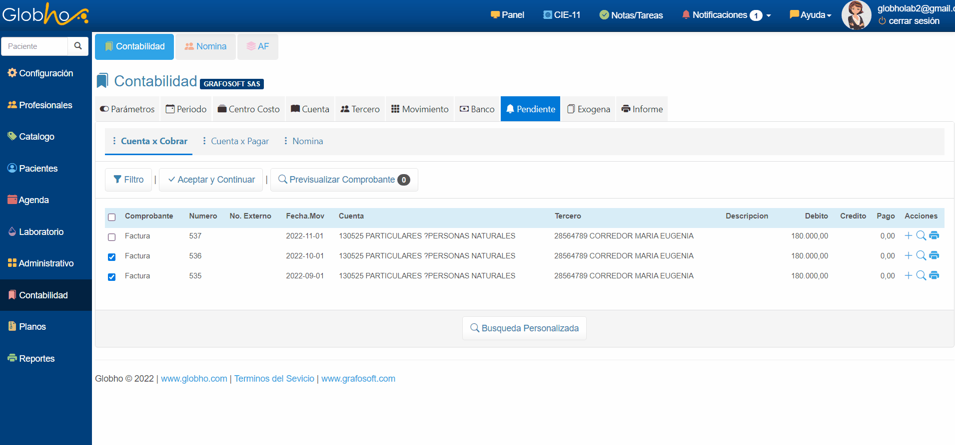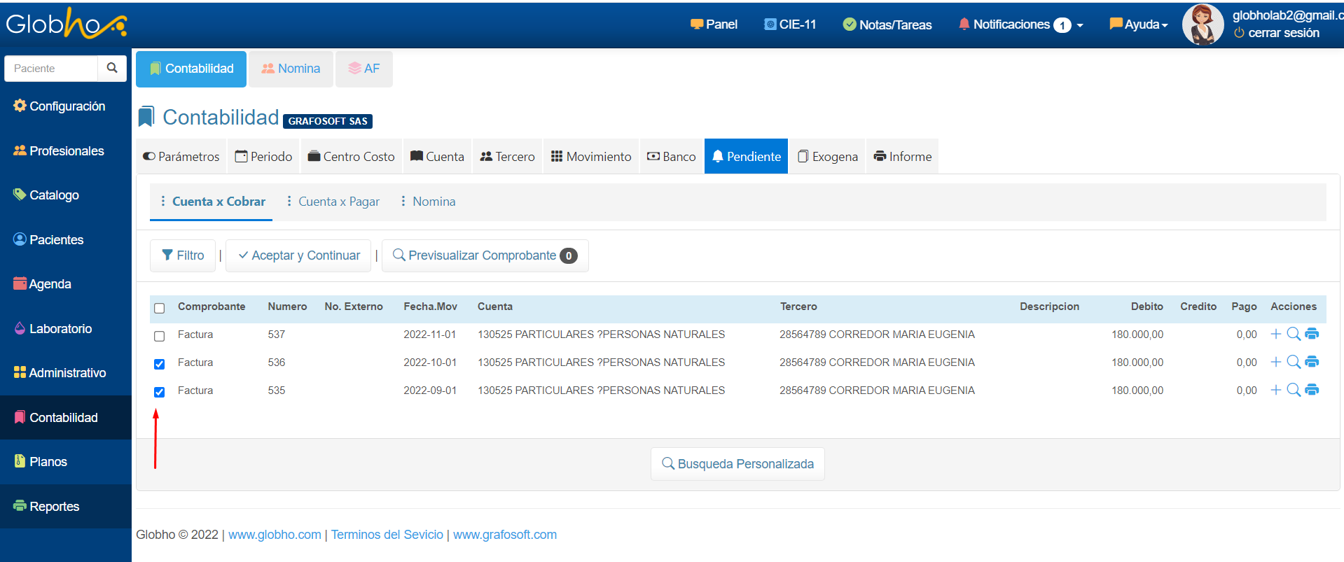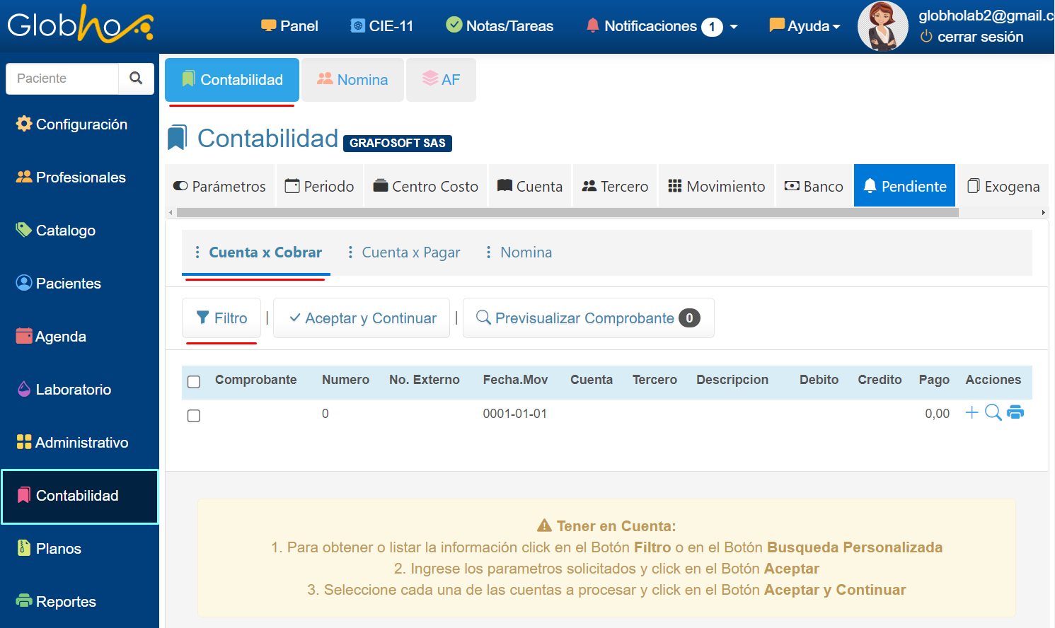 1. Haz clic en Menú Contabilidad y selecciona la pestaña Pendiente. 2. Haz clic en el botón respectivo a las cuentas pendientes: Cuentas x Pagar, Cuentas x Cobrar ó Nómina. Para el ejercicio práctico, tomaremos el ejemplo Cuentas x Cobrar.