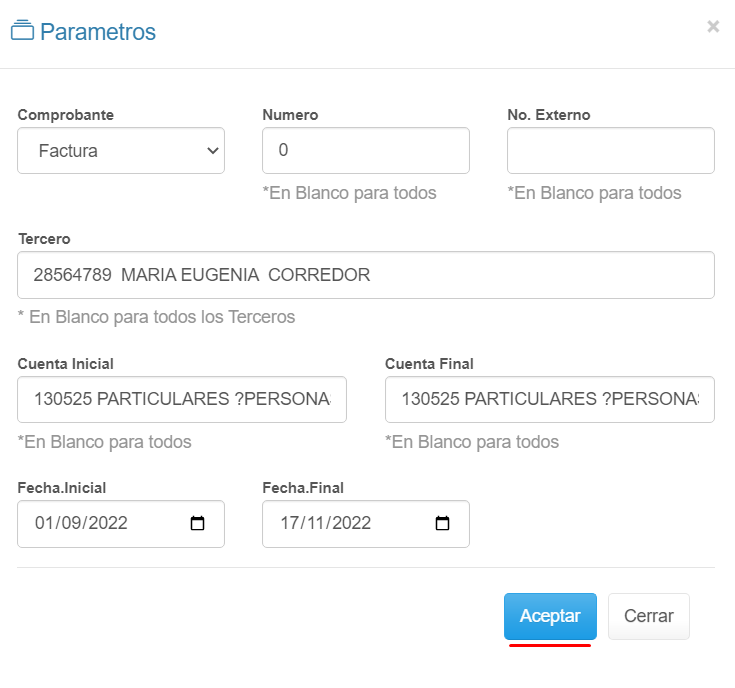 3. Diligencia los campos según los datos requeridos de la búsqueda del Pendiente y haz clic en el botón Aceptar.