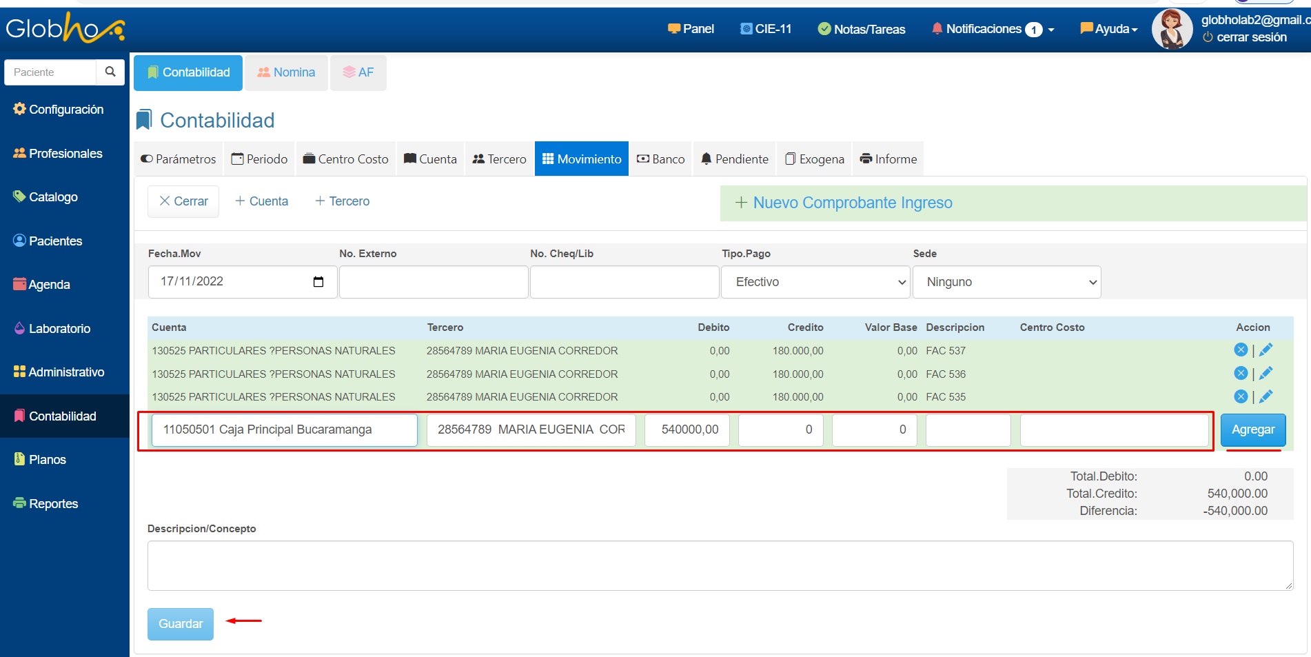 9. Termina de diligenciar el Comprobante con las correspondientes Cuentas Contables y haz clic en el botón Guardar.