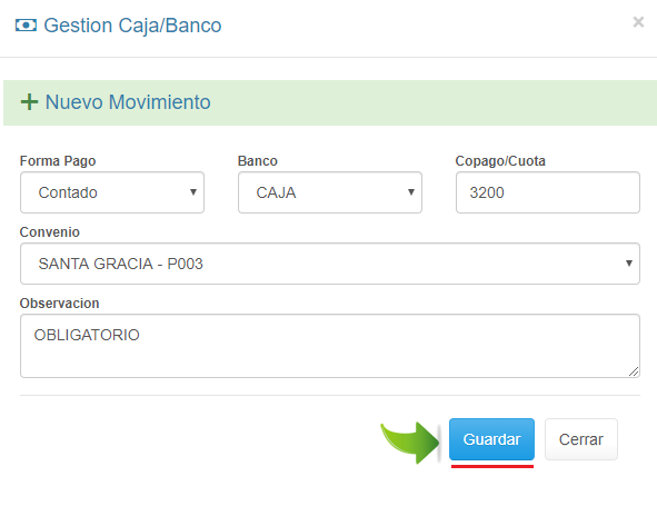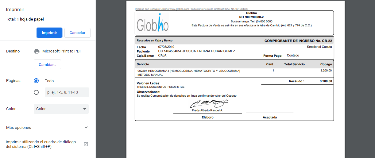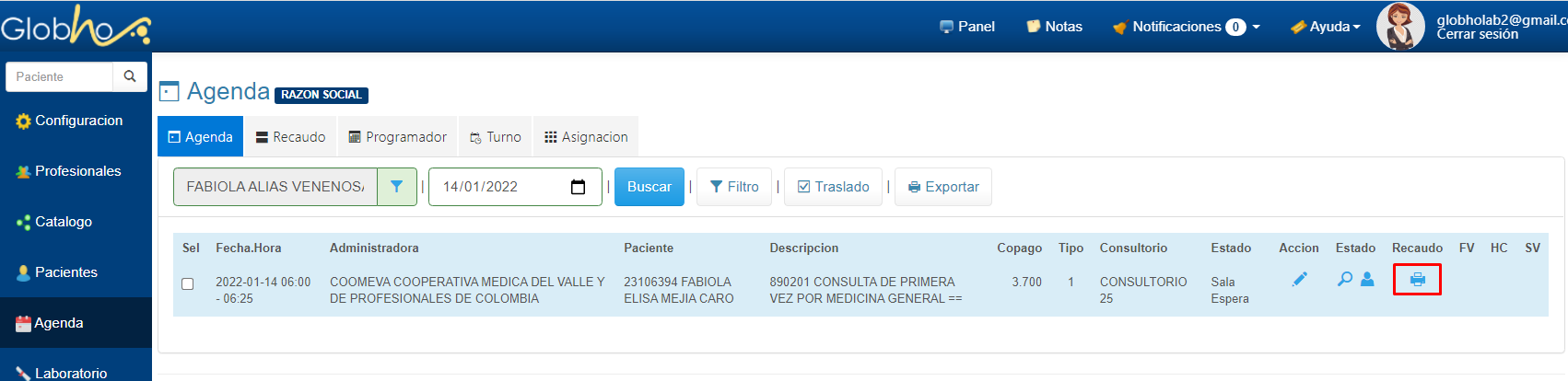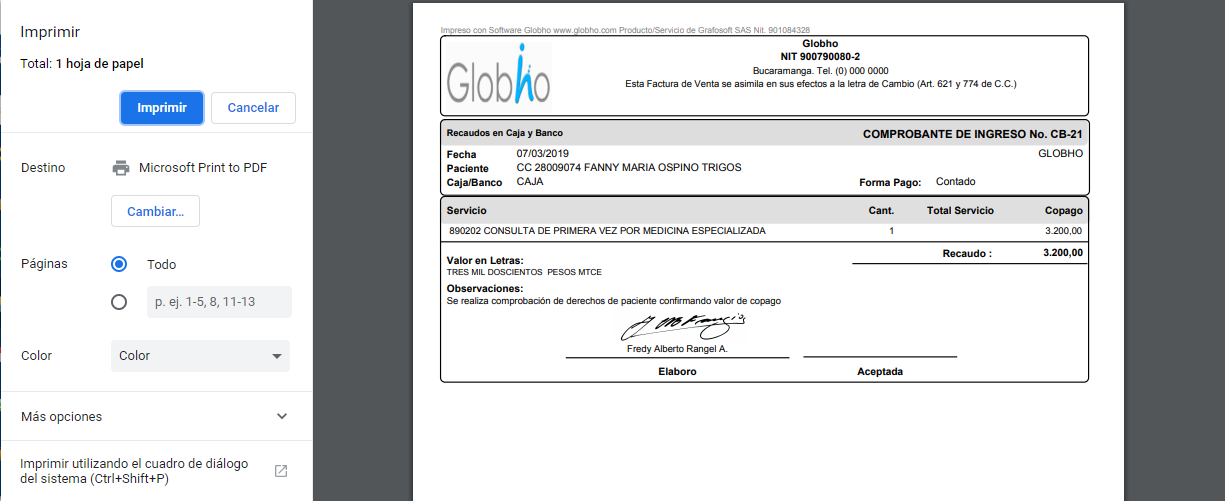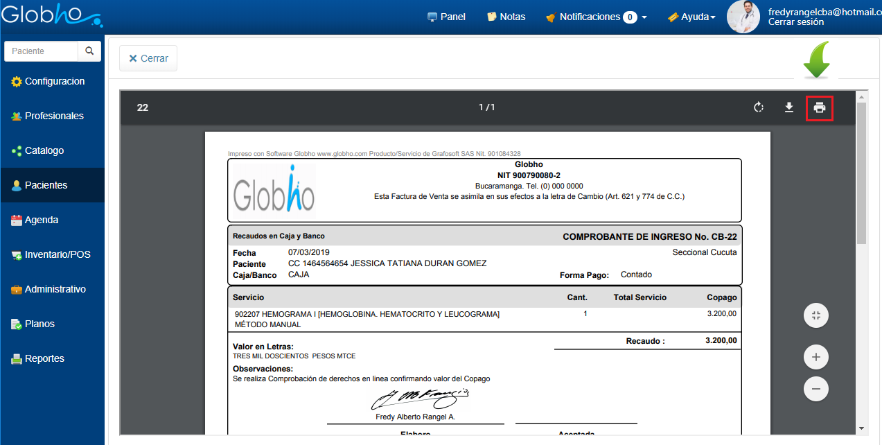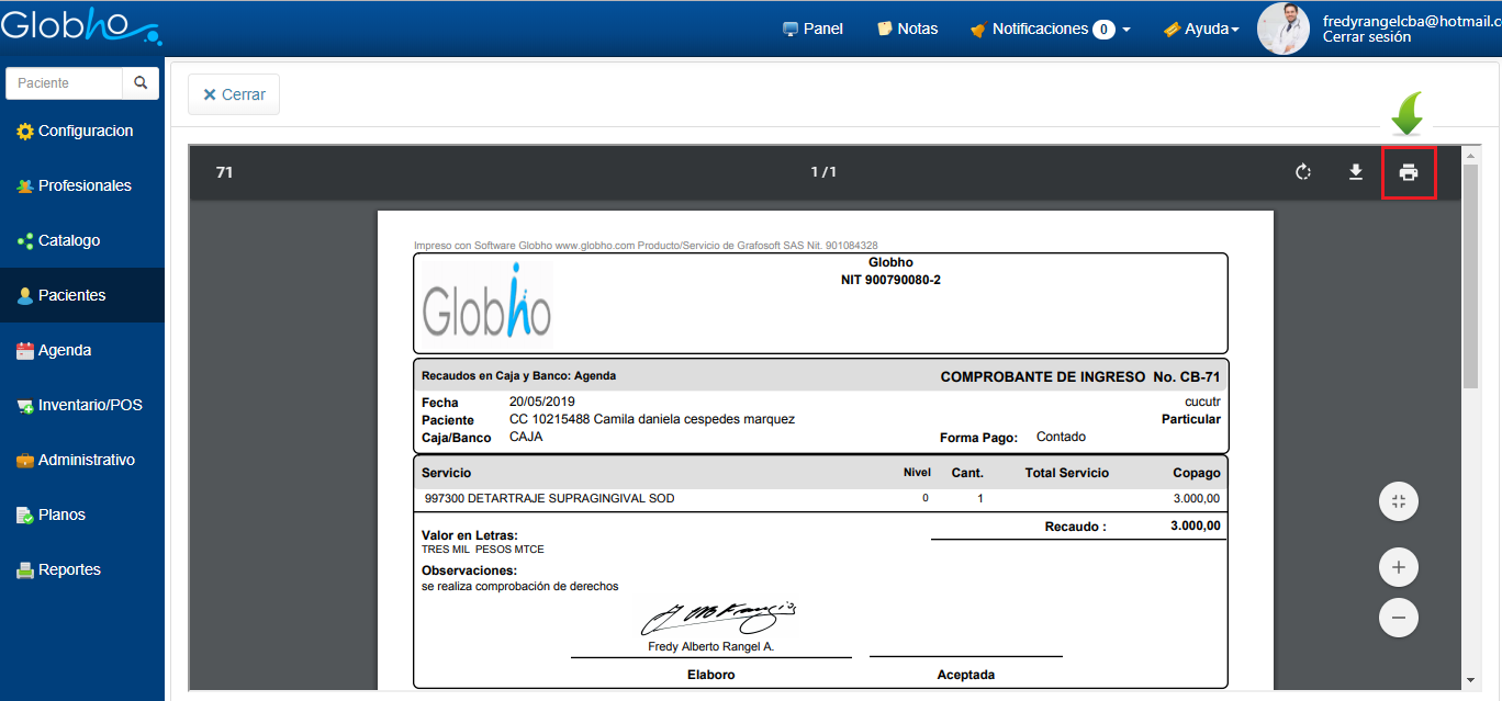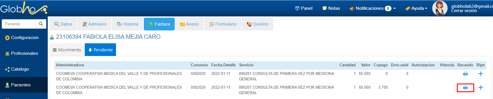 3. En lugar del icono en forma de signo +, se visualiza uno en forma de Impresora, haz clic ahí para Imprimir el Copago o Cuota.