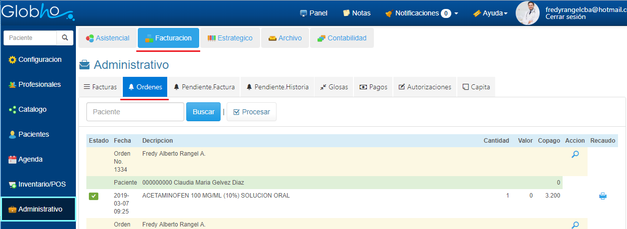 1. Ingresa al módulo Administrativo, en la pestaña Facturación haz clic en la opción Ordenes.