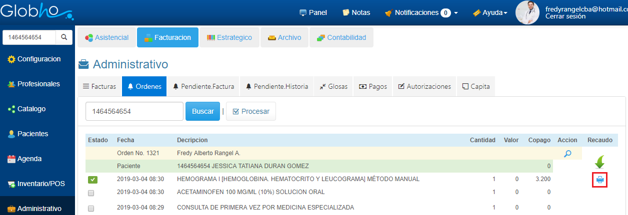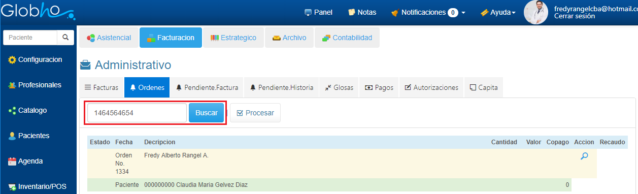2. Realiza la Búsqueda de la orden por medio de Numero de Identificación del Paciente.