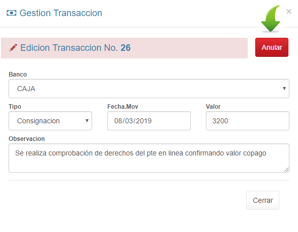 4. El registro del Recaudo ahora visualiza una A en su columna Estado que significa Anulado y en la columna Valor muestra un valor cero(0).