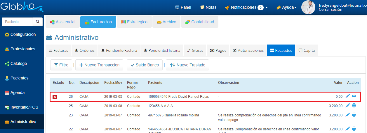 1. Ingresa al módulo Administrativo, en la pestaña Facturación haz clic en la opción Recaudos. 2. Haz clic en el icono en forma de Lápiz, ubicado en el registro del recaudo que vas a Anular.