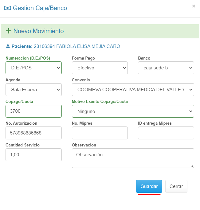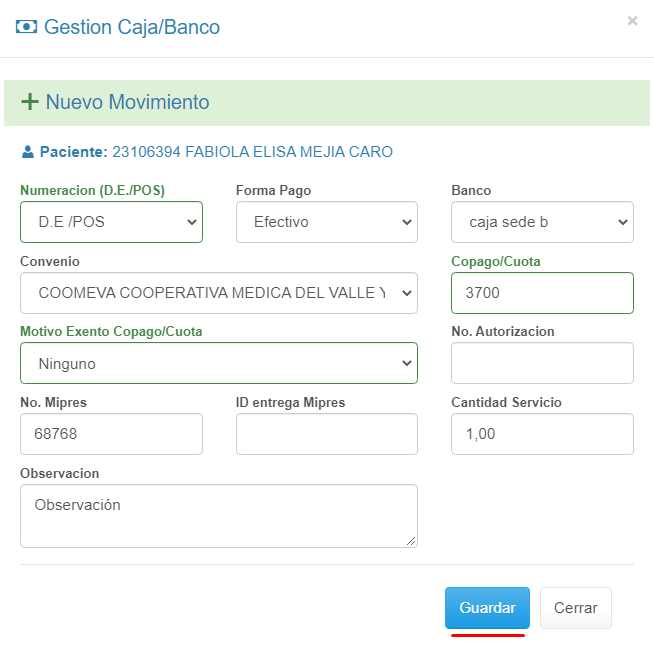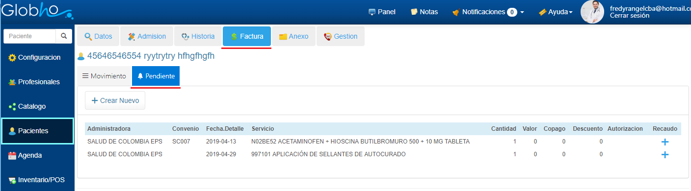 1. Selecciona el Paciente al que le vas a realizar el registro. Ver aquí 2. Selecciona Factura y en la sección Movimiento haz clic en Crear Nuevo.