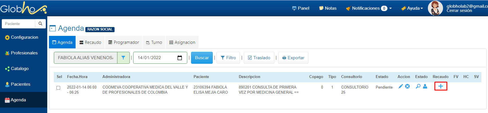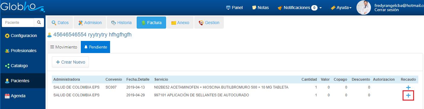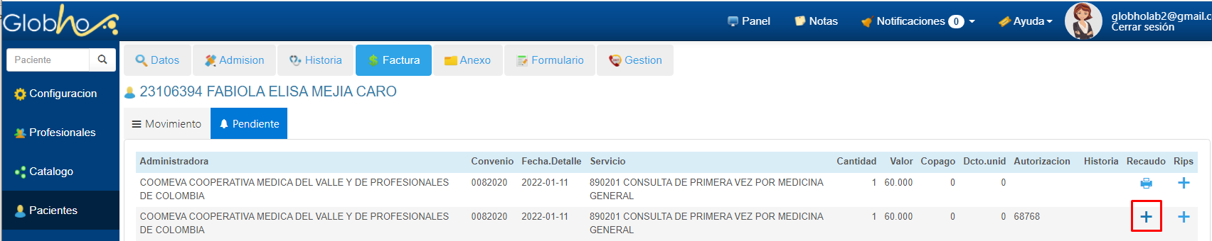 1. Ingresa al módulo Pacientes, en la pestaña Facturación haz clic en la opción Pendientes. 2. Haz clic en el icono en forma de +, ubicado en el registro del recaudo que vas a gestionar.