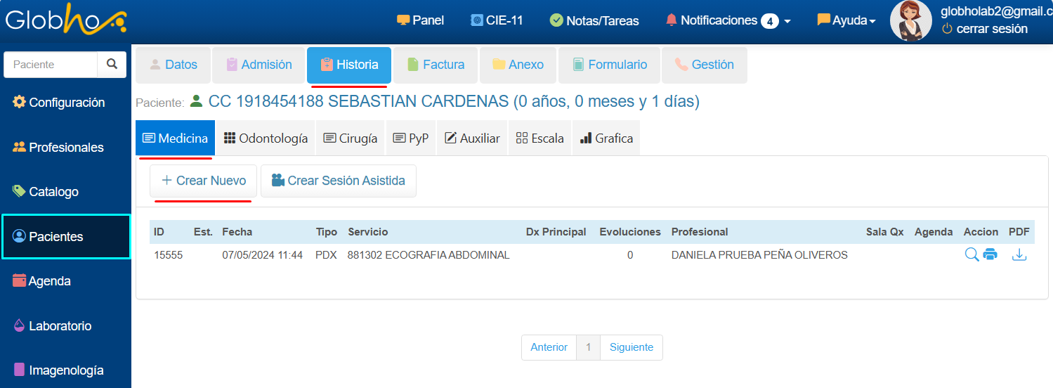 1. Selecciona el Paciente al que le vas a realizar el registro de Procedimiento Diagnóstico. Ver aquí 2. Haz clic en Historia y selecciona la opción Medicina, Crear Nuevo.