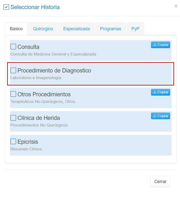 3. Selecciona la plantilla con el servicio que desees registrar, para este caso, Procedimiento de Diagnóstico.