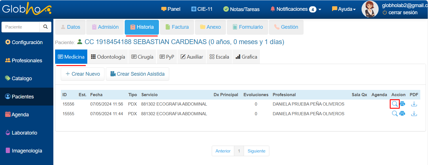 1. Selecciona el Paciente al que le vas a registrar el resultado de Procedimiento Diagnóstico ingresado. Ver aquí 2. Haz clic en Historia y selecciona la opción Medicina. Haz clic en la Lupa al final del registro correspondiente.