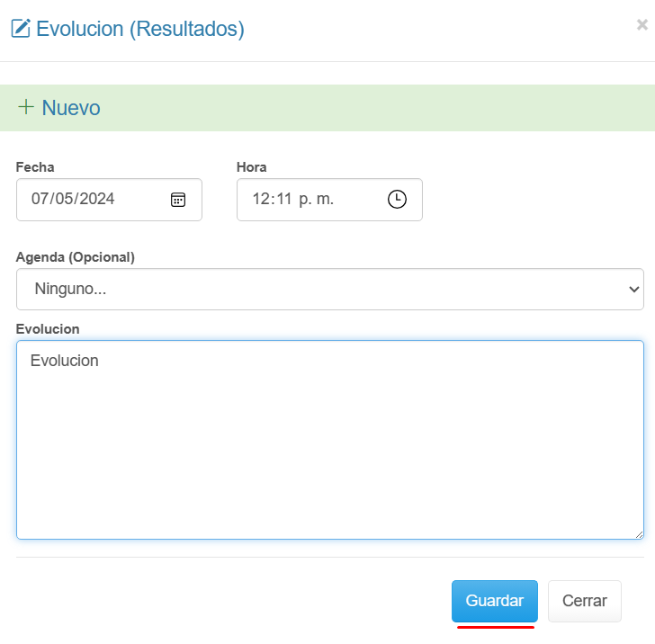 4. Diligencia los datos del formulario, y pulsa el botón Guardar. Selecciona el campo agenda únicamente sí se creó una cita para lectura y/o registro del resultado.