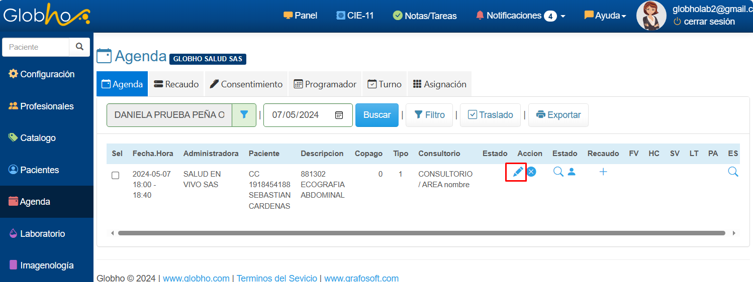 1. Ingresa a menú Agenda / agenda y haz clic en el lápiz correspondiente a la cita que deseas gestionar.