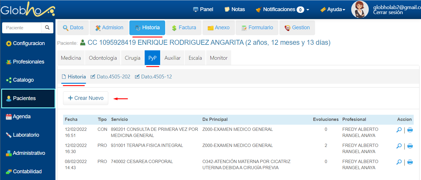 1. Selecciona el Paciente al que le vas a realizar el registro. Ver aquí 2. Ingresa a Historia, selecciona PyP. 3. Haz clic en el botón Crear Nuevo y selecciona la Hístoria deseas diligenciar.