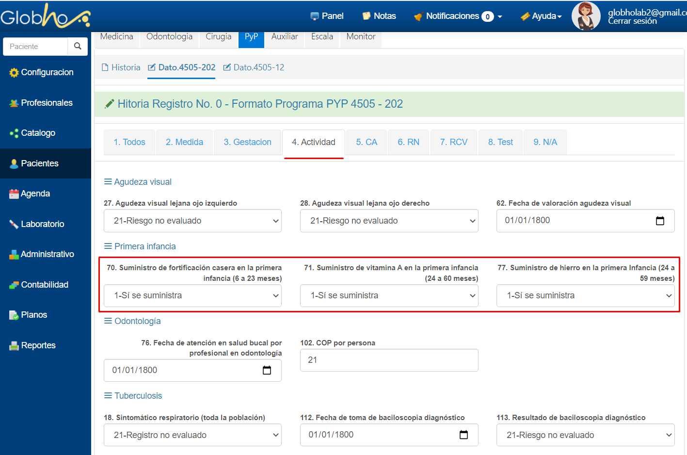 1. Selecciona el Paciente al que le vas a realizar el registro. Ver aquí 2. Ingresa a Historia, selecciona PyP. 3. Ubicate en la pestaña que contenga las variables requeridas, ingresa o selecciona las mismas y al finalizar haz clic en Guardar correspondiente a la pestaña de registro. Por ejemplo: Primera Infancia.