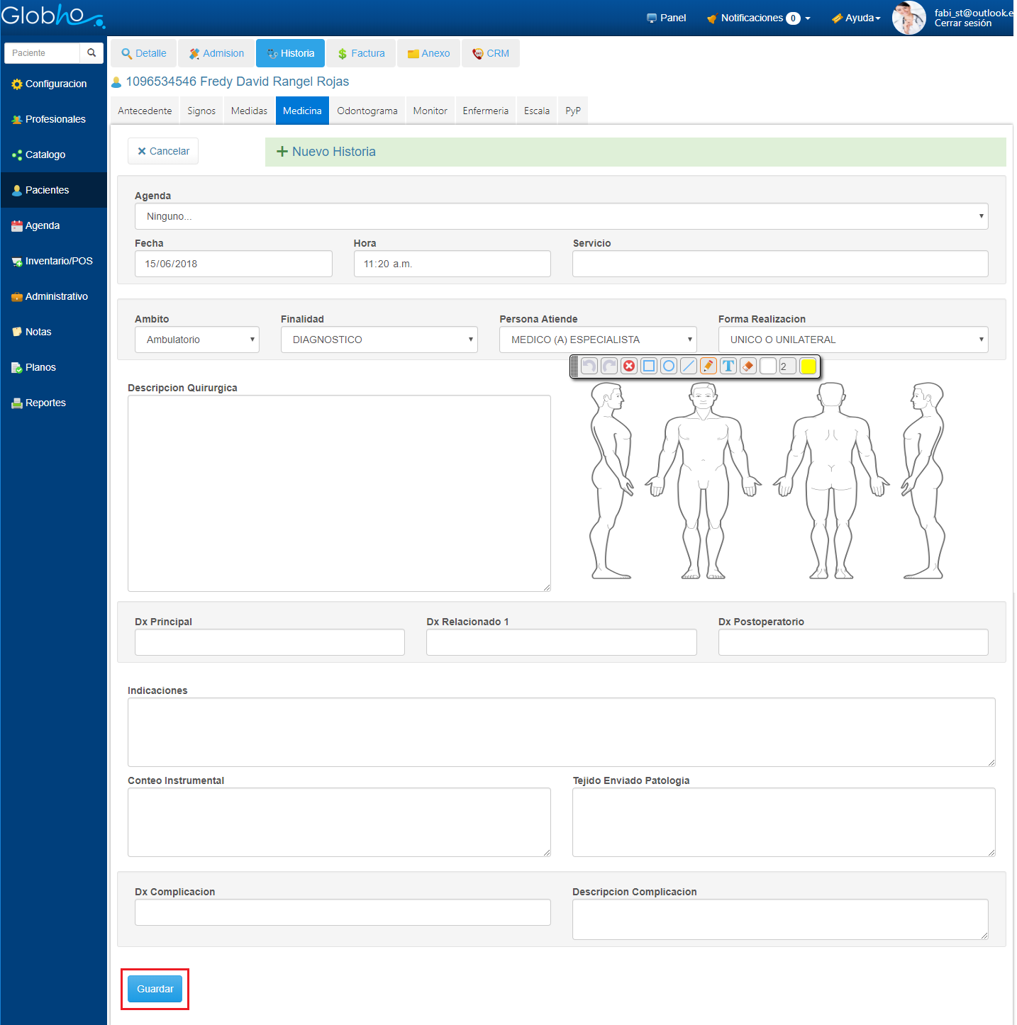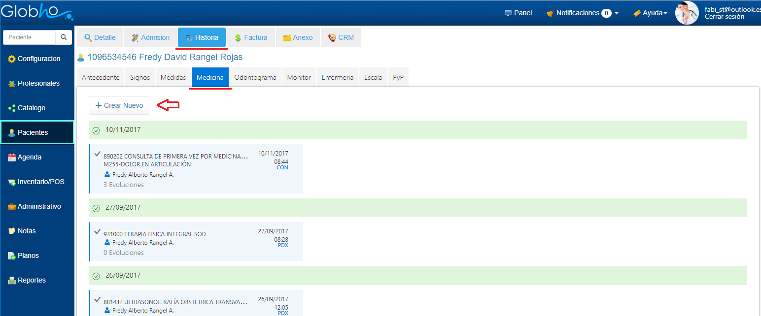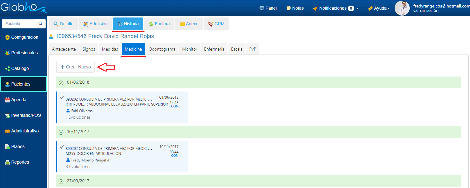 1. Selecciona el Paciente al que le vas a realizar el registro. Ver aquí 2. Haz clic en Historia y selecciona la opción Medicina, Crear Nuevo.