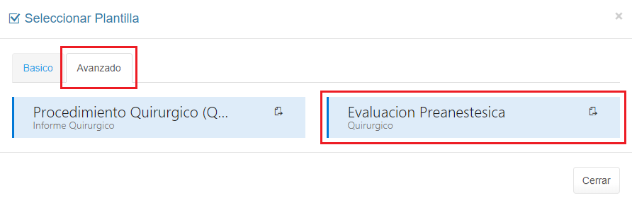 3. Selecciona la pestaña Avanzado y haz clic en la plantilla Evaluación Preanestesica.