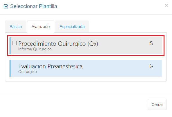 3. Selecciona la plantilla con el servicio que desees registrar, para este caso, haz clic en Procedimientos Quirúrgico.