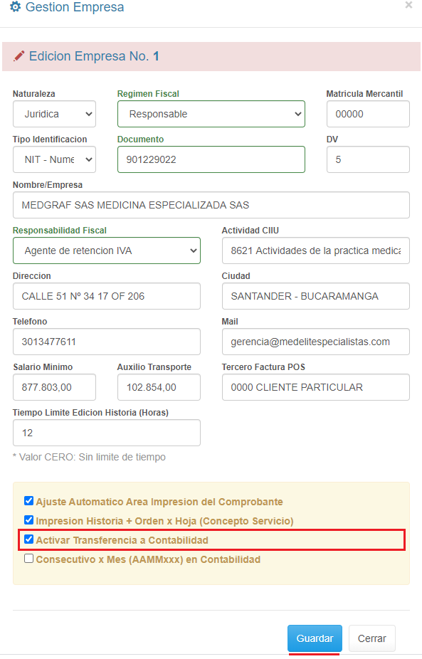 2. Selecciona la casilla de verificación Activar Transferencia a Contabilidad y haz clic en el botón Guardar.